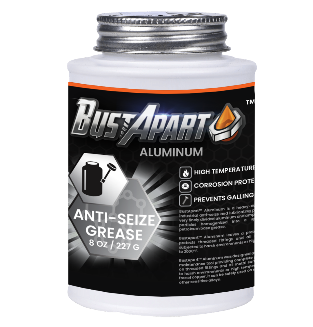 Bust Apart Aluminum is a general purpose anti-seize lubricant, sealant and protective coating to use wherever metal contacts metal. Covers any metal with a protective resistant coating that acts as a barrier to withstand extreme heat, pressure and friction. Stops corrosion, is non-melting, waterproof and highly resistant to chemicals, solvents and gases (except oxygen). Contains synthetic oil, extremely fine aluminum & graphite particles.